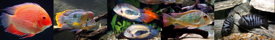 Среднеразмерные и крупные цихлиды Нового Света. Цихлазомы Меека, цихлазомы чернополосые, цихлазомы чернополосые альбиносы, цихлазомы бриллиантовые, цихлазомы глазчатые и другие цихлиды Нового Света – виды крайне агрессивные. Однако многим аквариумистам нравится наблюдать, как особи выясняют отношения, защищают свои территории и заботятся о мальках. Как правило, с цихлидами Нового Света также уживаются плекостомусы, сомы-кукушки (многопятнистые синодонтисы), пангасиусы и взрослые лабео. На протяжении первого года жизни группе этих рыб потребуется тропический речной аквариум не менее 100л. Взрослым особям нужен аквариум от 200л.