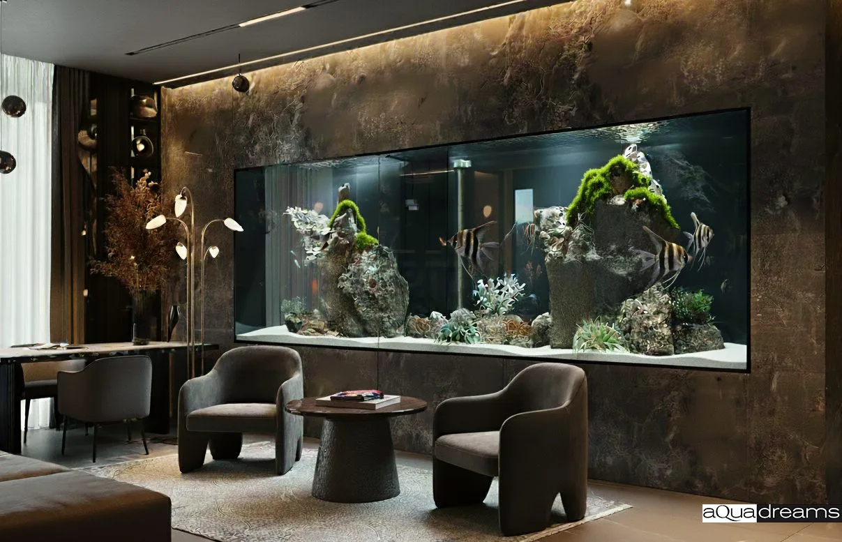 Роскошный встроенный аквариум с объемными композициями из скал. Создает атмосферу уюта и элегантности, подчеркивая статус и изысканный вкус интерьера
