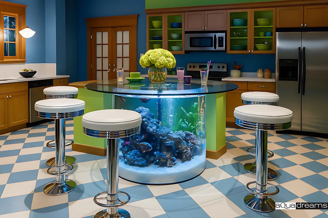 Аквариум-стол — оригинальное интерьерное решение, объединяющее функциональность и эффектную эстетику. Прозрачный цилиндрический корпус с коралловым рифом и мягкой подсветкой превращает барную зону в настоящий морской уголок. Идеален для кухонь и лаунж-пространств, создавая расслабляющую атмосферу и стильный акцент в интерьере.