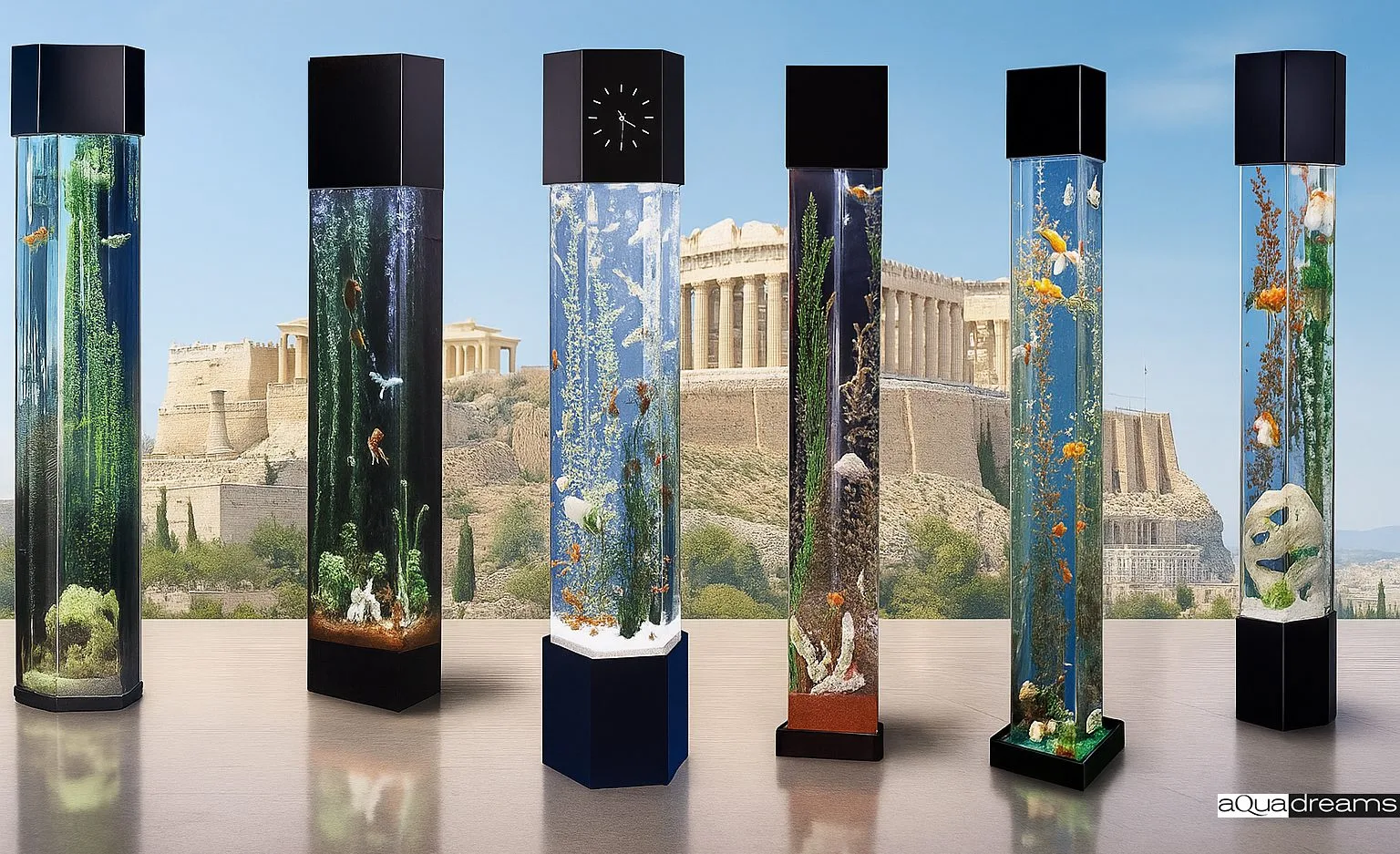 Аквариумы башни, разработанные дизайнерами в 80-е годы прошлого столетия специально для небольших пространств, являются исключительно дизайнерским продуктом и требуют профессионального ухода. Ярко освещённый аквариум башня, сочетающий высокопрочный гнутый акриловый корпус и стенд из акрилового камня, всегда остаётся в центре внимания, отвлекая от окружающей суеты. На вершине водной башни могут быть установлены кварцевые часы, обрамлённые роскошной латунью или сталью.