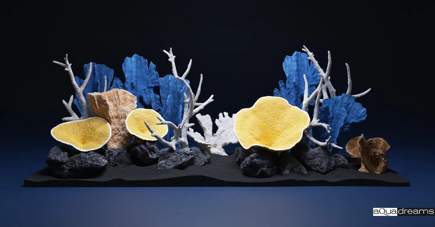 Коралловая композиция с контрастным сочетанием голубых кораллов, белых ветвистых акропор и желтых турбинарий. Создаёт чистую, архитектурную композицию с чёткими линиями и объёмом. Идеальный арт-объект для аквариума в современном стиле.