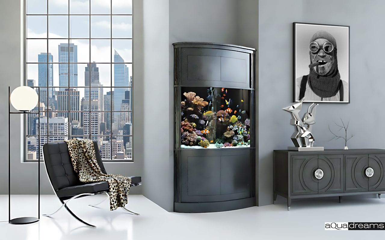 Угловой аквариум сочетает элегантный дизайн и функциональность, эффективно заполняя пространство. Подводный мир с кораллами и яркими рыбами создаёт атмосферу уюта и гармонии. Идеальное решение для стильных интерьеров с акцентом на природную красоту. минималистичном стиле.