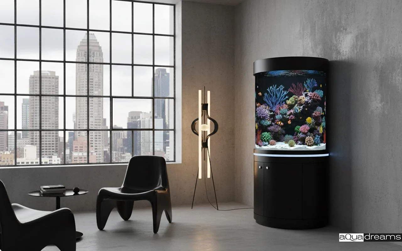 Элегантный полуцилиндрический аквариум с панорамным обзором и ярким коралловым рифом гармонично вписывается в современные интерьеры. Лаконичный корпус с нижней тумбой скрывает оборудование, сохраняя чистоту линий. Идеальное решение для офисов, холлов и жилых пространств.