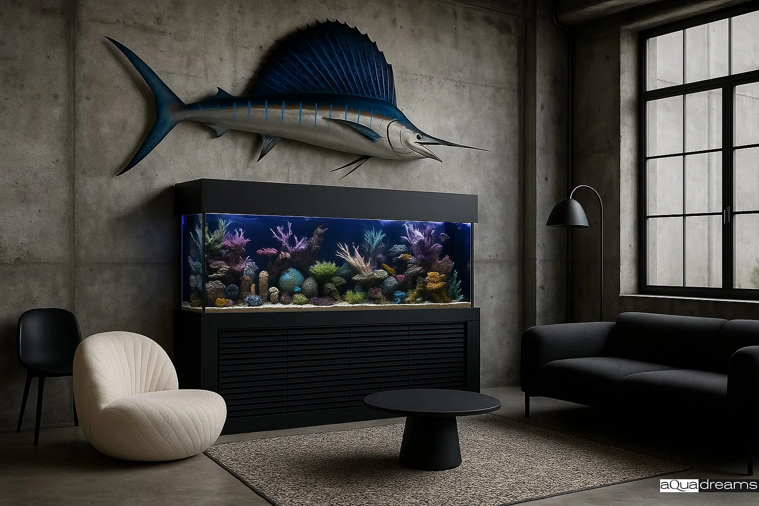 Современный аквариум с жалюзийными фасадами идеально вписывается в интерьеры в стиле лофт. Лаконичный корпус подчёркивает индустриальную эстетику, а рифовый пейзаж внутри создаёт яркий акцент. Практичное решение, скрывающее всё оборудование, придаёт конструкции чистоту и завершённость.