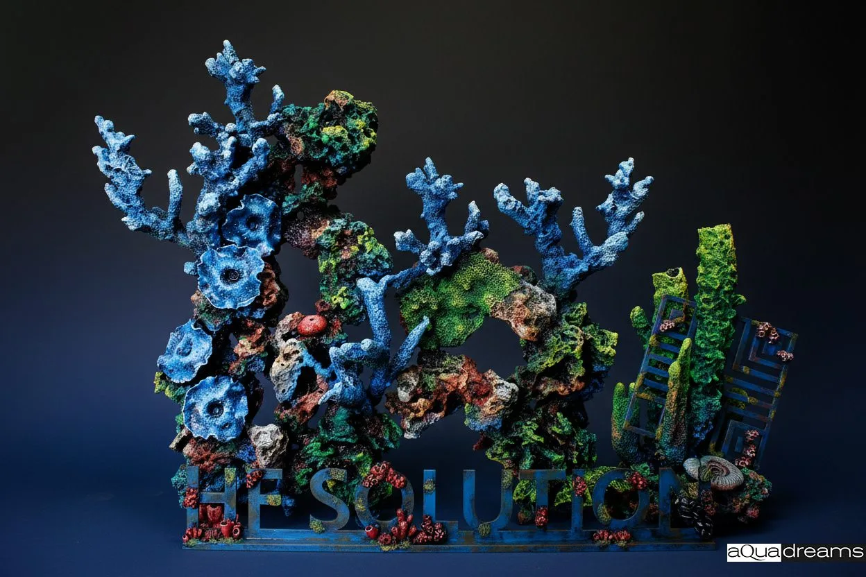 Яркая коралловая композиция с логотипом, выполненная в насыщенных синих и зелёных тонах. Декорация сочетает ветвистые кораллы, губки и текстурированные элементы, создавая эффект живого рифа. Идеально подходит как эффектный центральный акцент в аквариуме.