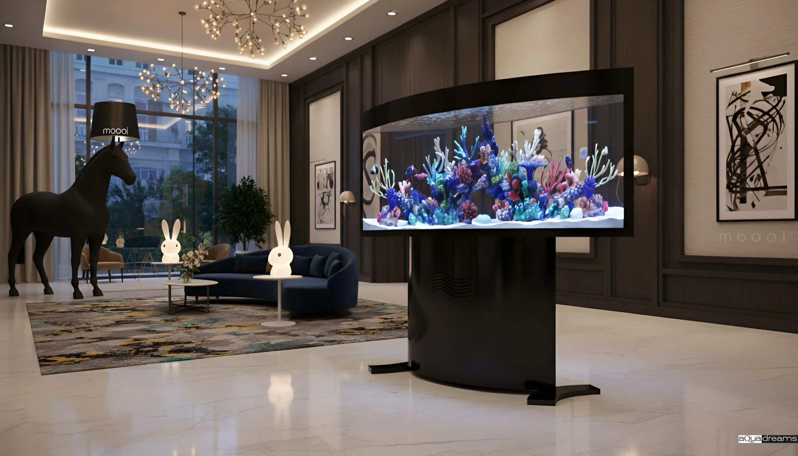 Панорамный аквариум с эффектной изогнутой формой создаёт ощущение глубины и динамики. Его прозрачный корпус подчёркивает яркий коралловый риф и позволяет наслаждаться видом с любой стороны. Идеальное решение для роскошных интерьеров, отелей и приёмных зон.