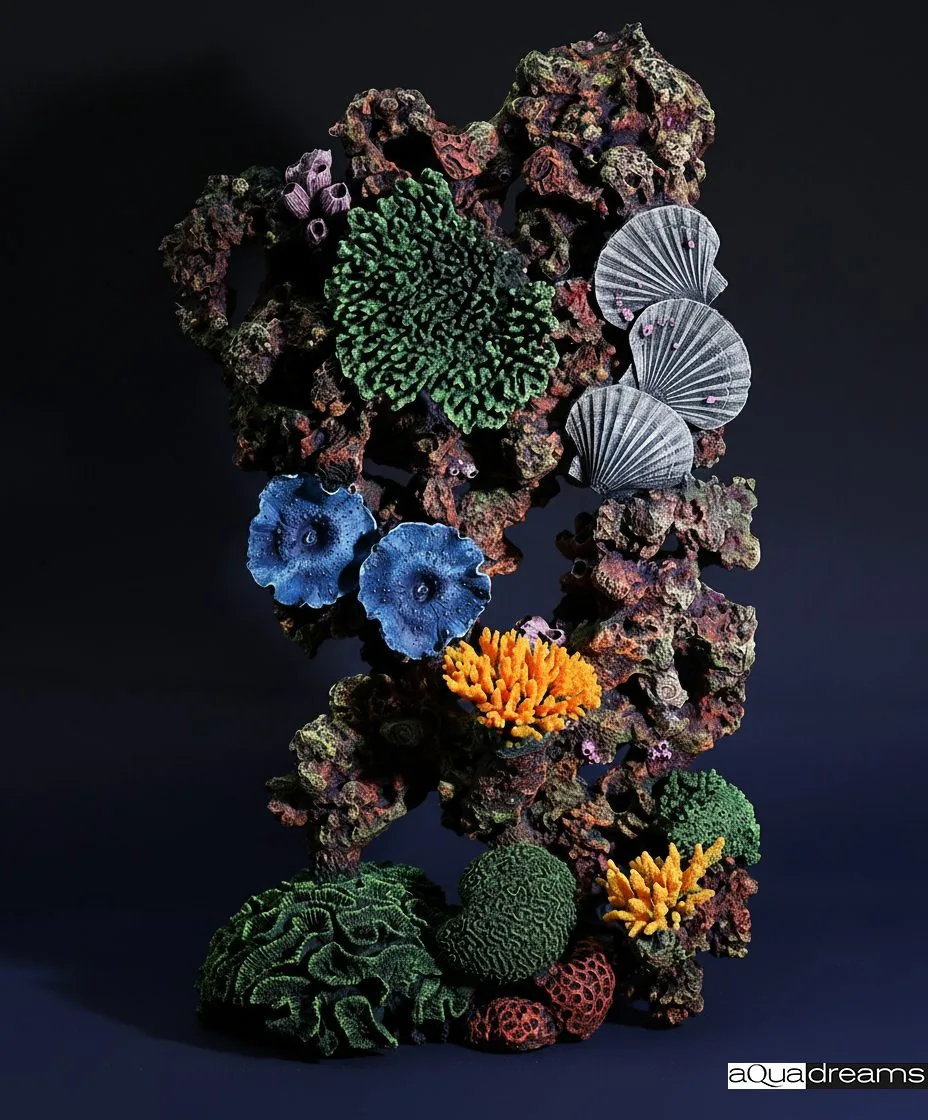 Вертикальная рифовая вставка с богатой фактурой и насыщенными коралловыми акцентами. Создаёт эффект глубины и визуально увеличивает высоту аквариума, при этом не занимает много места на дне. Отлично подходит для оформления заднего плана и зонирования пространства.