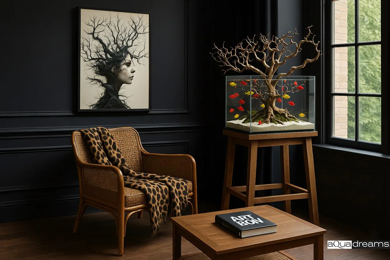 Дизайнерский аквариум в стиле ретро, созданный как яркий акцент современного интерьера. Авторская композиция с «деревом жизни» и контрастными рыбами подчёркивает индивидуальность пространства, добавляя глубину, эстетику и утончённый характер. Идеальный выбор для ценителей стиля и уникального дизайна.