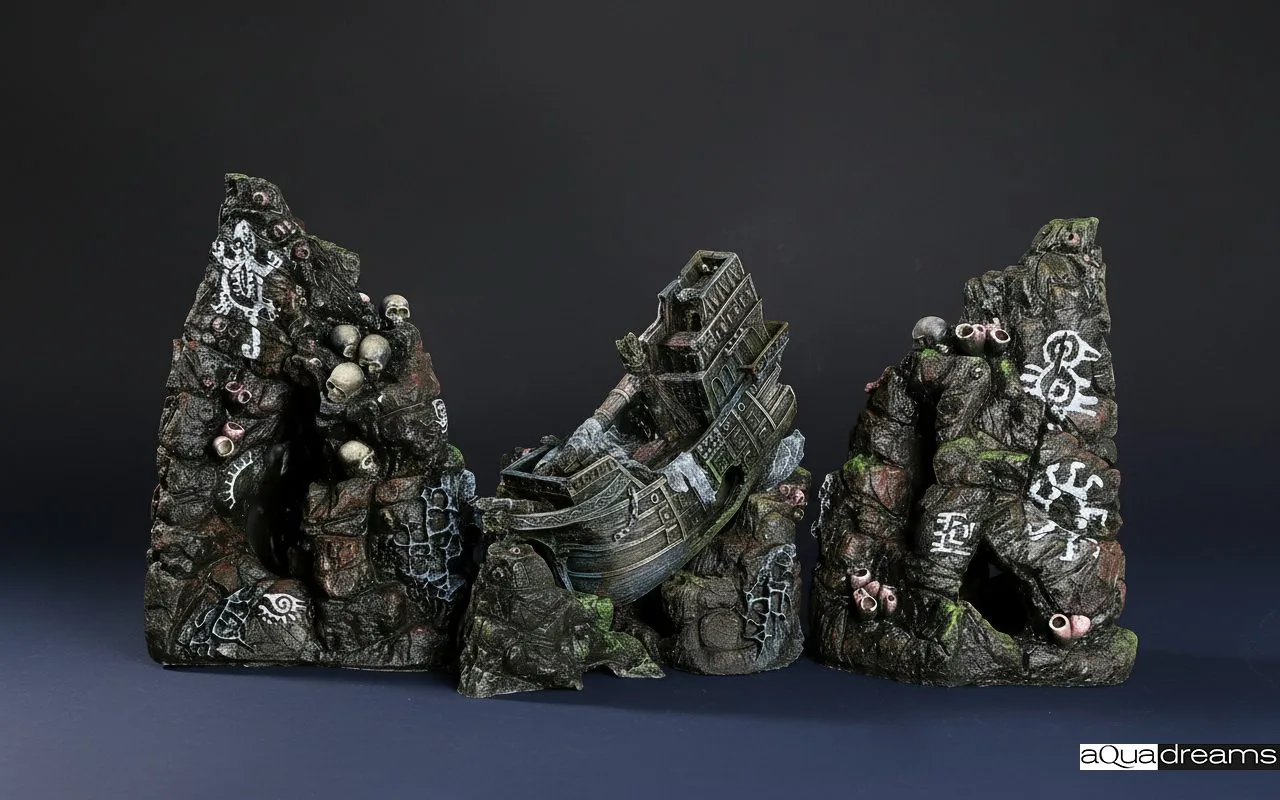 Эта эффектная декорация в виде затонувшего испанского галеона придаёт аквариуму атмосферу таинственности и приключений. Корпус корабля детализирован до мелочей — прорезанные борта, рельефная резьба, якорная цепь, потёртые паруса и следы времени создают ощущение древнего артефакта, затонувшего много веков назад.