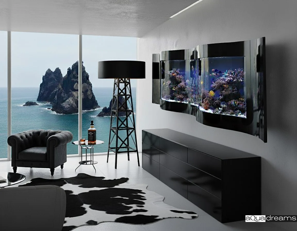 Аквариум с изящной волнообразной формой, создающей плавный и динамичный силуэт. Прочные материалы и продуманная конструкция делают его идеальным выбором для современных интерьеров.